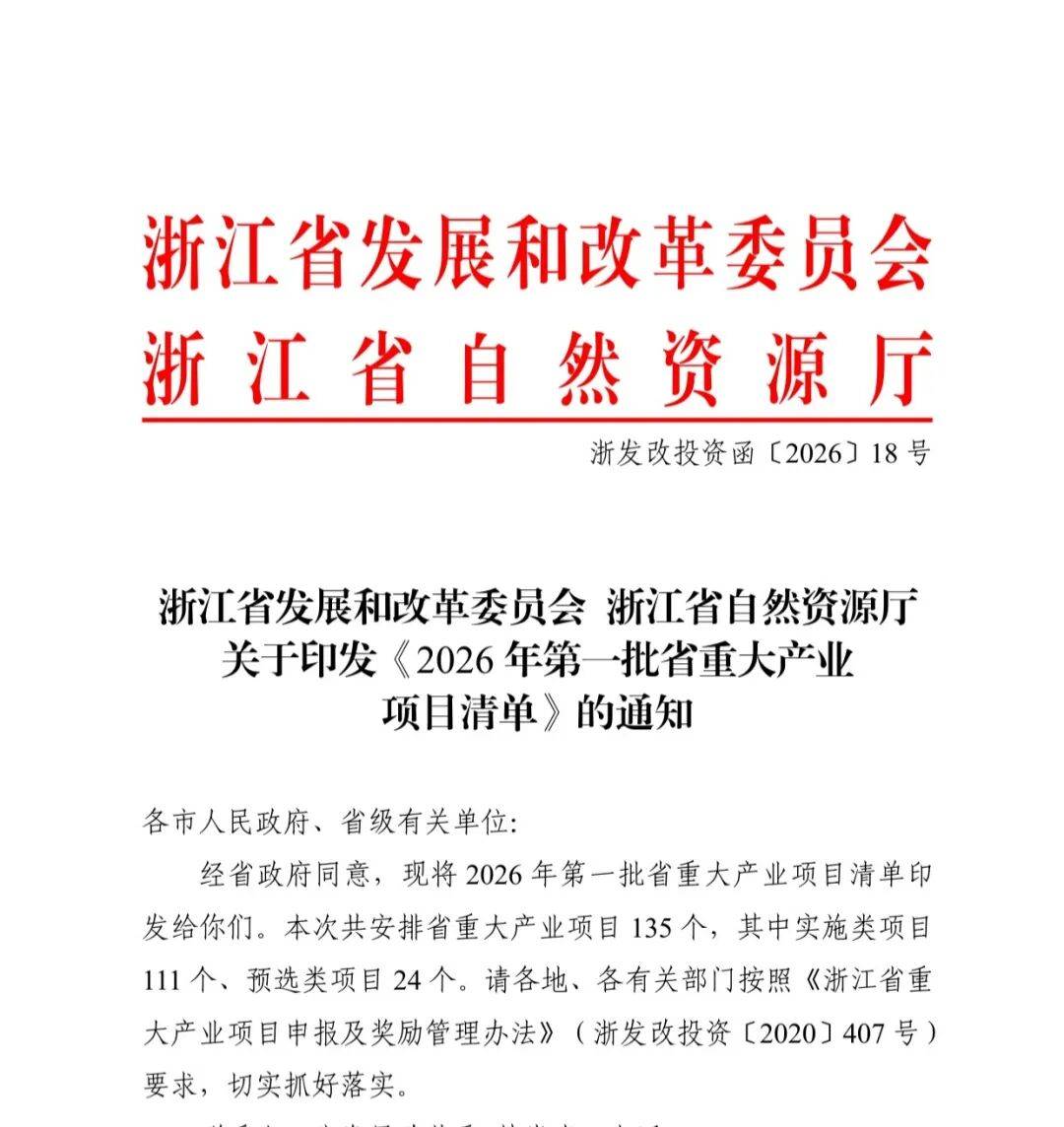 日前,省发展改革委、省自然资源厅发文公布2026年第一批省重大产业项目名单,我市26个项目纳入清单,占全省比重的23.42%,居全省第1,其中:特别重大项目2个,示范性项目24个;获奖励用地指标1271.48亩,占全省比重的18.7%,居全省第2。