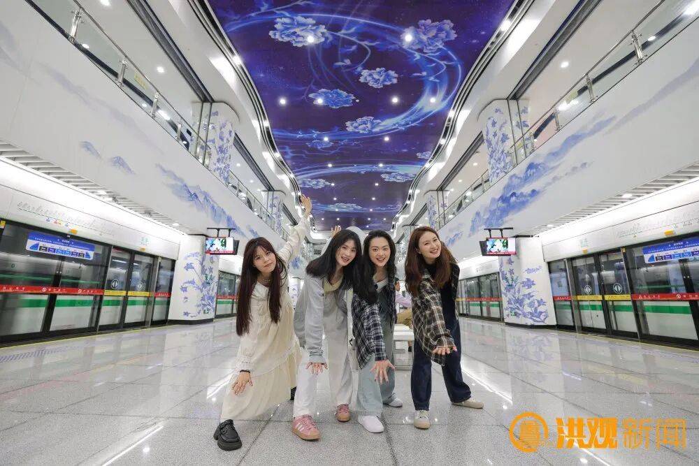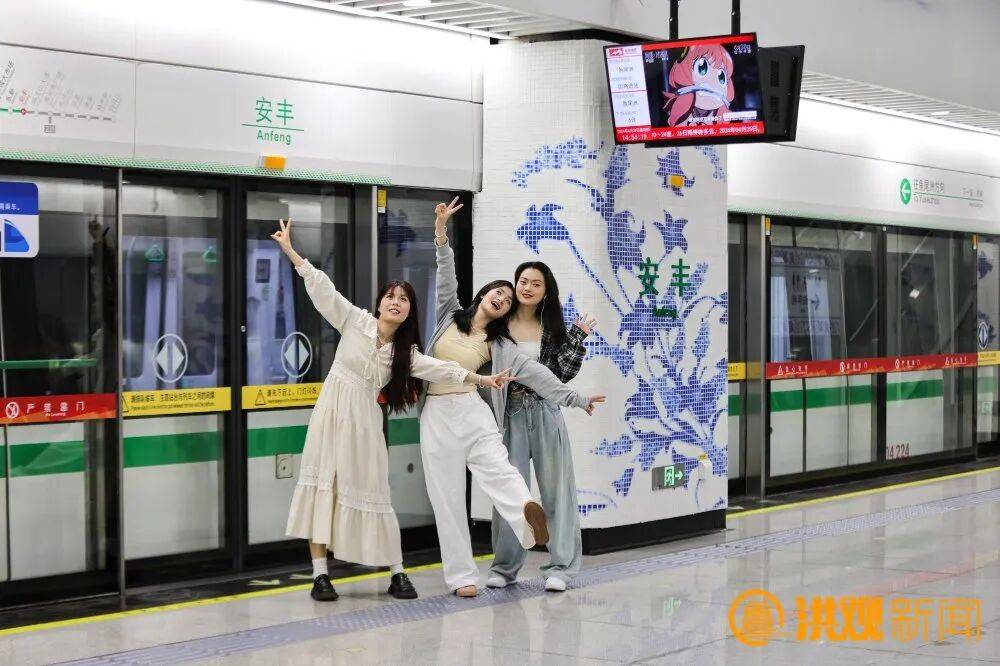 南昌地铁的“颜值”与“内涵”,早已成为这座英雄城的一张新文旅名片。八一广场站的《回眸展望》文化墙,萃取城市地标建筑与抽象山水元素,以科技感编排串联起南昌古今发展脉络,藏着英雄城的厚重底蕴;绳金塔站将白墙青砖、古剑金绳等历史元素与星空元素相融,抬头可见璀璨“星辰”,低头皆是历史印记,让千年古塔的厚重与星空的浪漫在此碰撞交织;怀玉山大道站则主打“赛博朋克”风格,提取网络虚拟符号打造智能空间,尽显南昌的现代化与数字化活力,成为年轻群体打卡的热门站点。“本来是坐地铁去绳金塔景区,结果在站内就拍了半个多小时。”来自武汉的游客吴晴笑着说道。